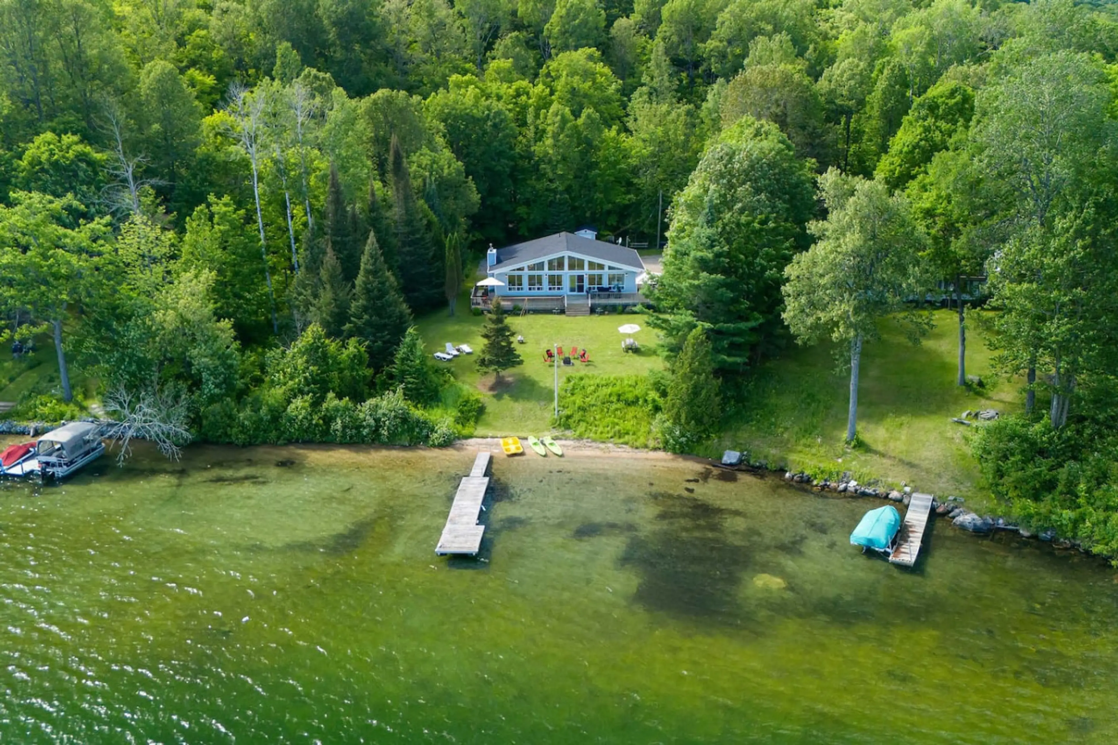 #CITQ : 319118 Évadez vous dans notre chalet luxueux au bord du lac Blue Sea. Détente garantie pour toute la famille. Ce havre de paix offre 4 chambres, une cuisine entièrement équipée, 2 salles de bain complètes, un foyer intérieur, et un accès direct au lac. À l'extérieur, profitez d'un foyer, d'u...